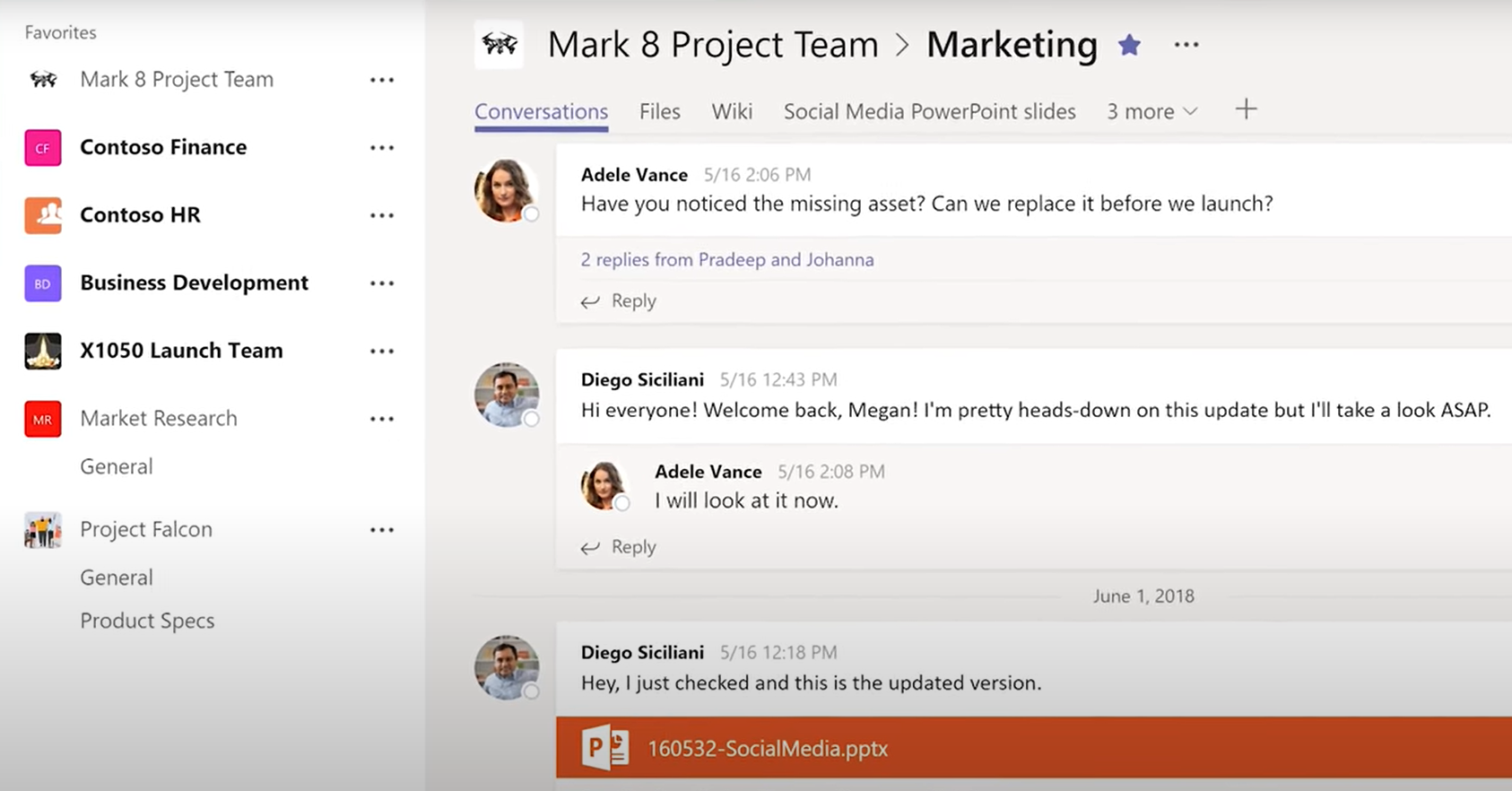 For example, in a specific project team, you can create a Marketing channel for the department to hold discussions, share, store and work on relevant documents. The team can pin files such as a PowerPoint presentation or Wiki to the top of the channel to easily access.